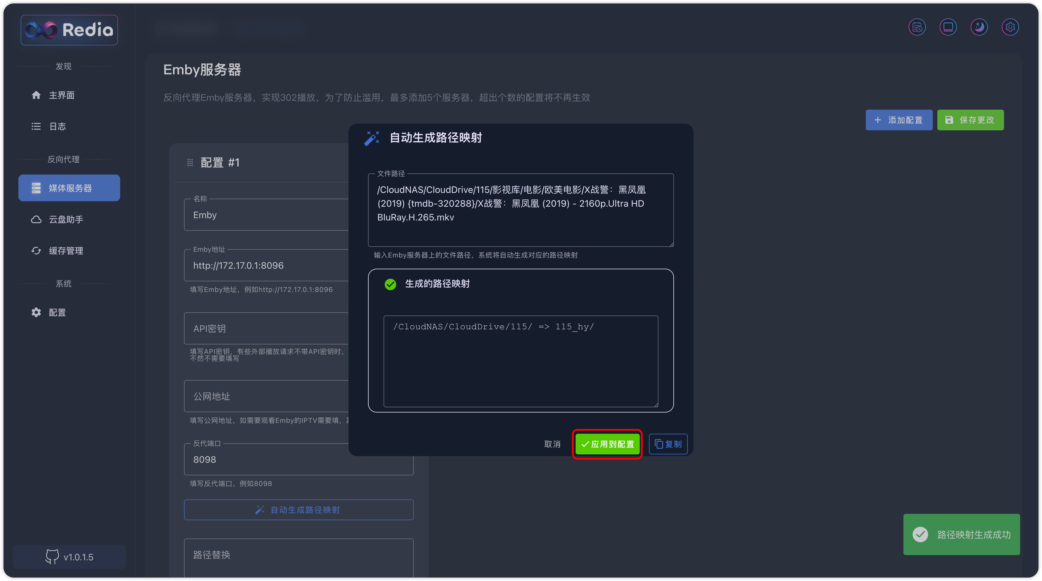 Strm文件,且路径中包含115,123,天翼云盘这样的字符,则可以直接使用【自动生成路径映射】。- 点击自动生成路径映射按钮。