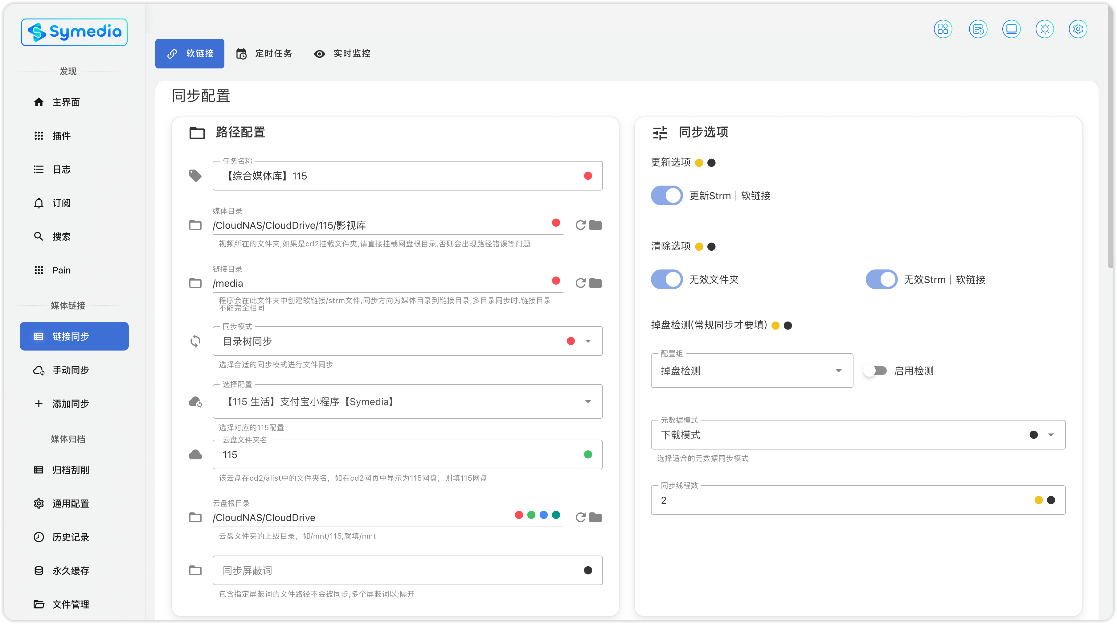 任务名称: 任务自定义名称。例如【综合媒体库】媒体目录: 网盘视频 所在的文件夹。例如【/CloudNAS/CloudDrive/115/影视库】链接目录: 本地存放 strm 的文件夹。例如【/media】同步模式: 目录树同步。115 配置: 选择对应的 115 配置。云盘文件夹名: 选择 115 选择云盘文件夹名字,例如 115(此名字填写在 CD2 网页中,你能看到的那个网盘名字)。云盘根目录: 选择在 CD2 中挂载点的名称,网盘路径是根路径。