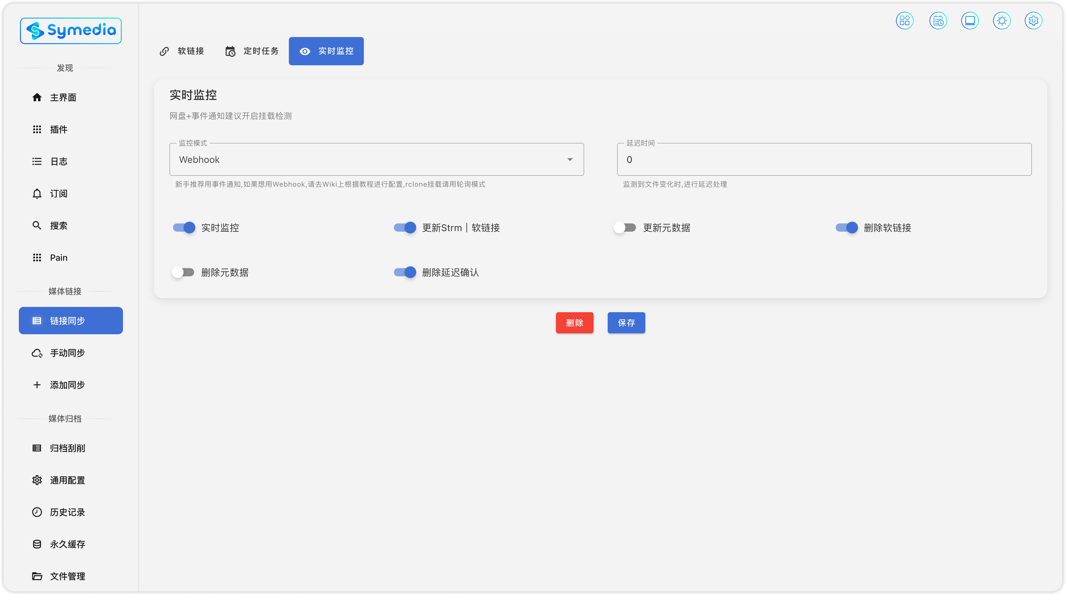 监控模式: 选择 webhook。延迟时间: 可以直接设置为 0 。如果你是其余不正经的,时长稍微设置长一些。实时监控: 建议开启。更新 Strm | 软连接: 这个必开。如果这个不开,等同于你压根就没用链接同步功能。删除软连接: 建议开启。删除延迟确认: 建议开启