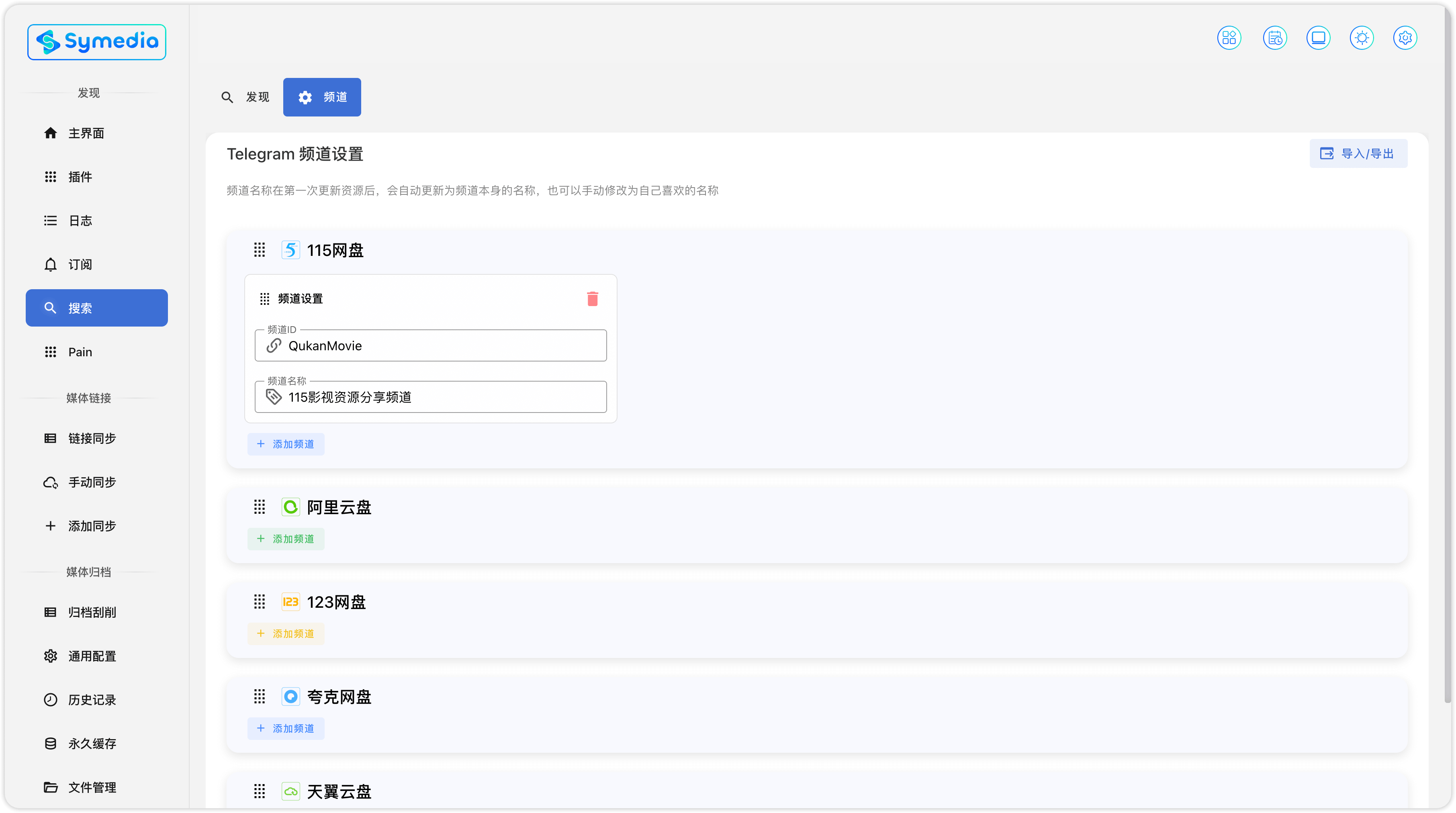 - 批量: 右上角选择,「导入/导出」,直接导入频道。