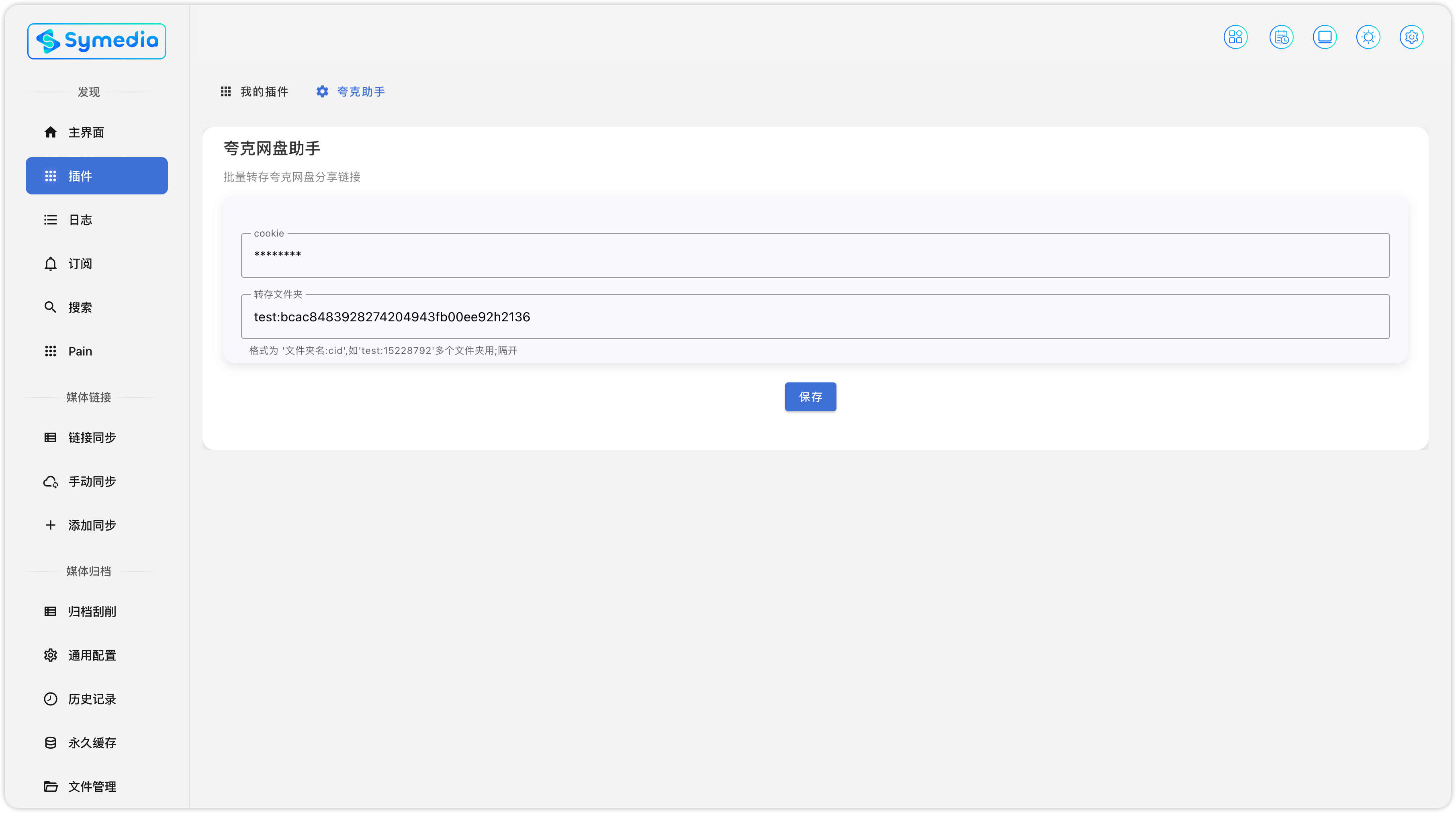 | 转存文件夹 | 非必填 | 填写你转存后需要存放的文件夹位置。 格式为 : 文件夹名:cid。多个文件夹用 ; 隔开。如 : test:bcac8483928274204943fb00ee92h2136。 |